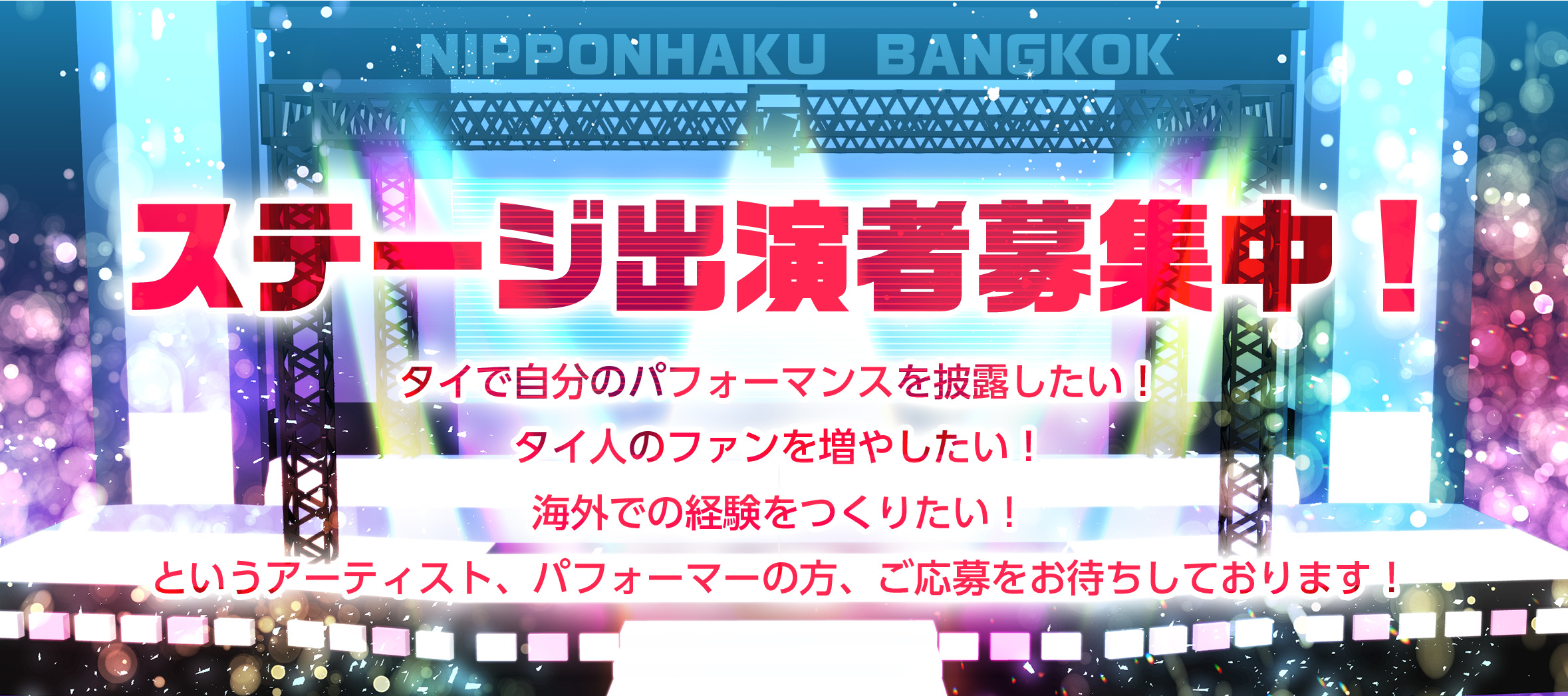 バンコク日本博では、ステージでパフォーマンスを披露したいアーティスト・パフォーマーの皆さんを一般公募にて募集しています。