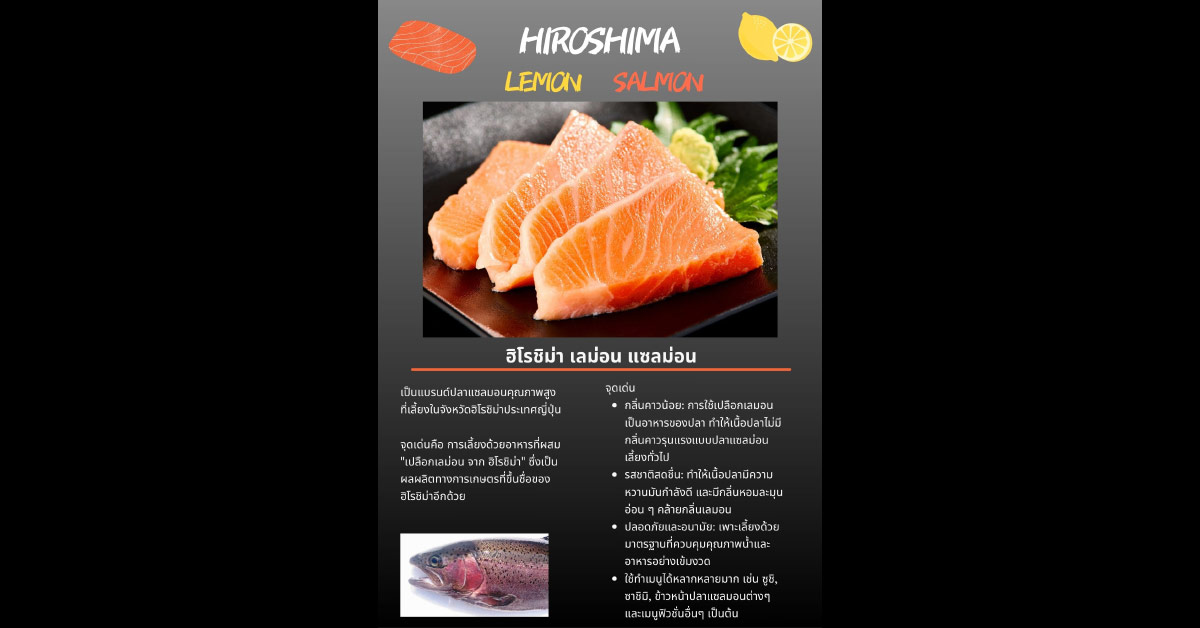 - ชามปลาแซลมอนมะนาวฮิโรชิม่า ทำจากปลาแซลมอนที่เกิดและเติบโตในฮิโรชิม่า ขจัดกลิ่นปลาเลี้ยงด้วยการเติมน้ำมะนาวฮิโรชิม่าลงในอาหาร